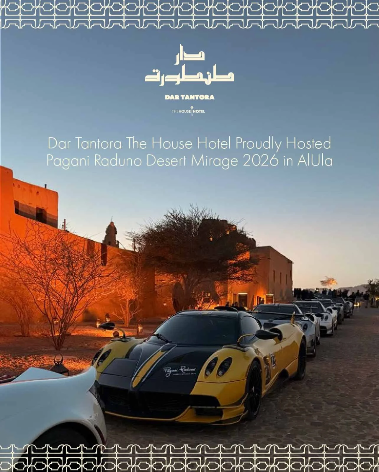 Dar Tantora The House Hotel proudly hosted the Pagani Raduno Desert Mirage 2026 in AlUla. An exclusive event that brought Pagani masterpieces into the ancient Nabataean landscape, where the precision of Italian engineering met the grandeur of the Saudi desert.